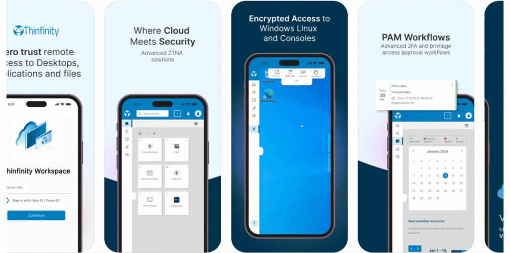 Each image must prominently feature the Thinfinity product, either in its interface or highlighting its key features, such as remote access capabilities, cloud-based functionality, and user-friendly design.